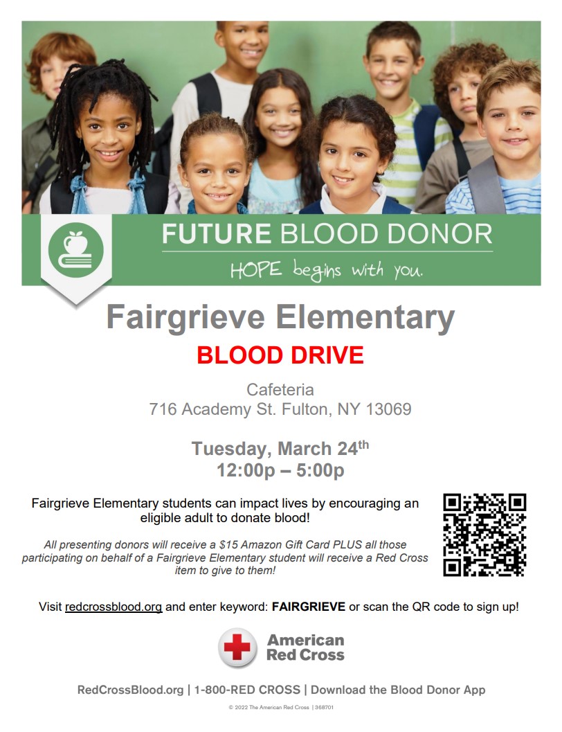 Fairgrieve Elementary Blood Drive - Tuesday March 24th, 12 to 5 pm